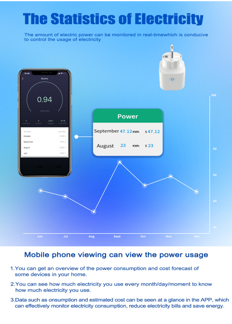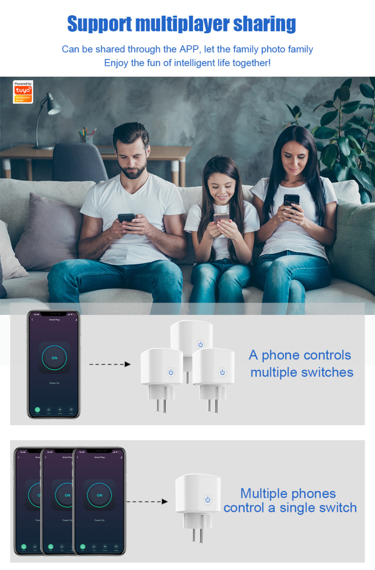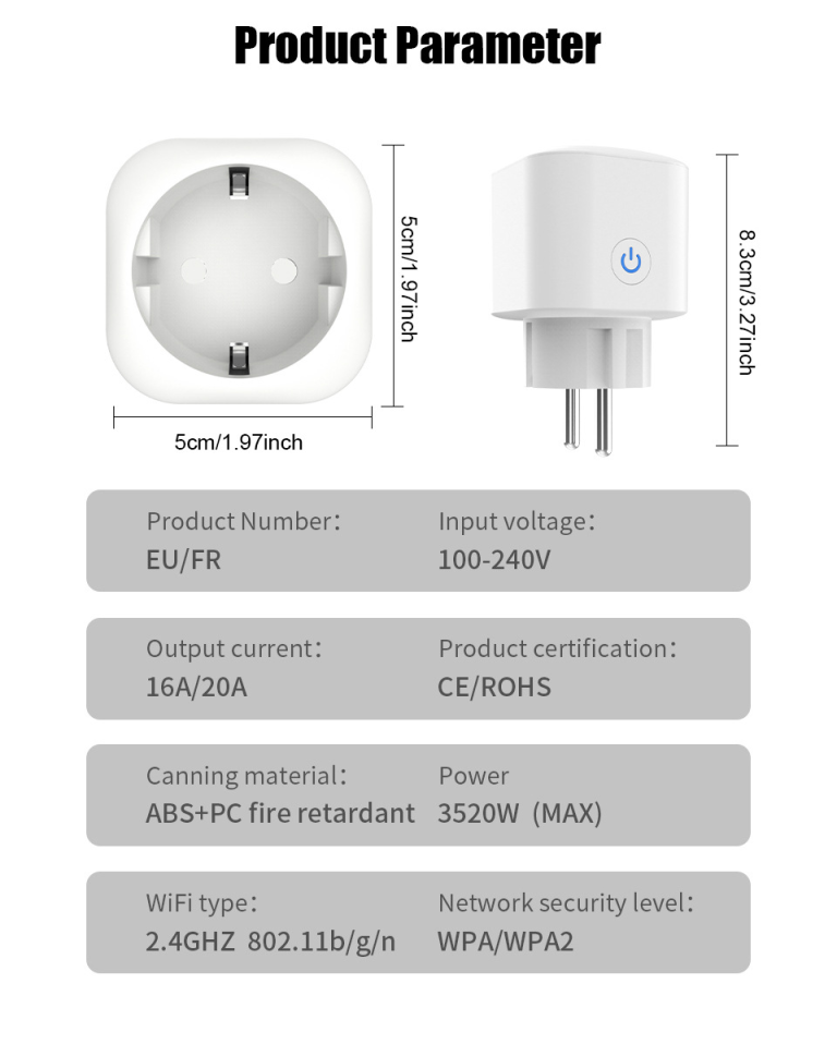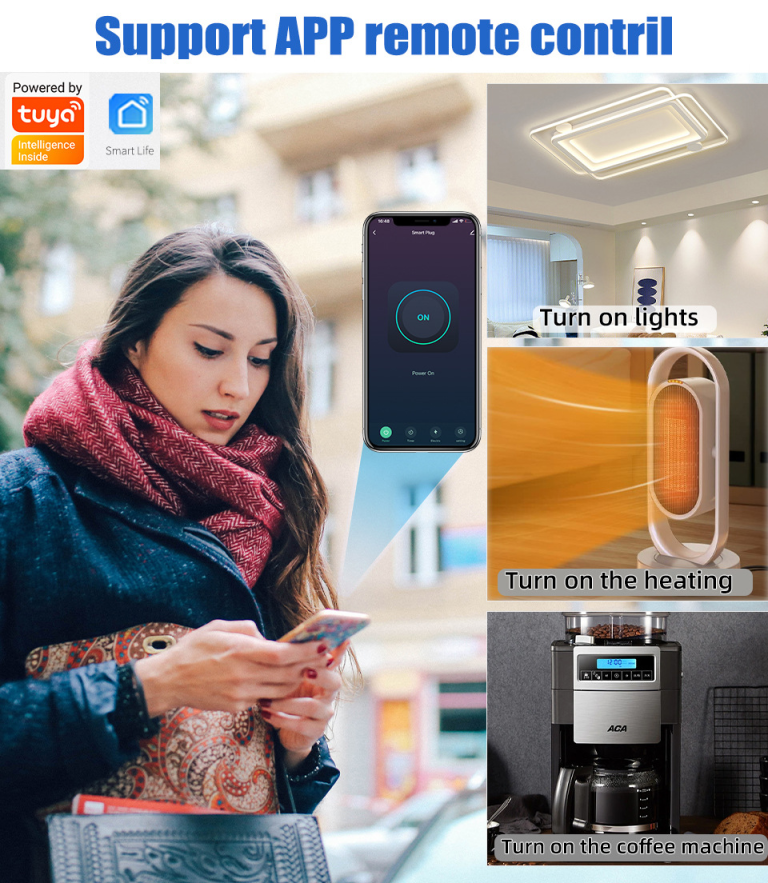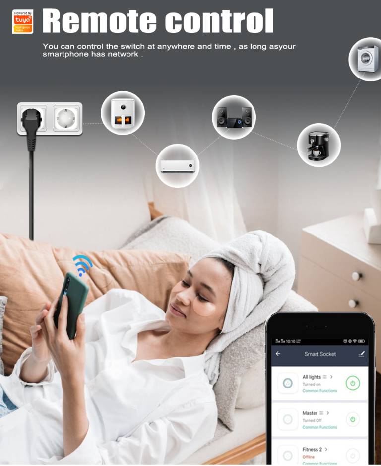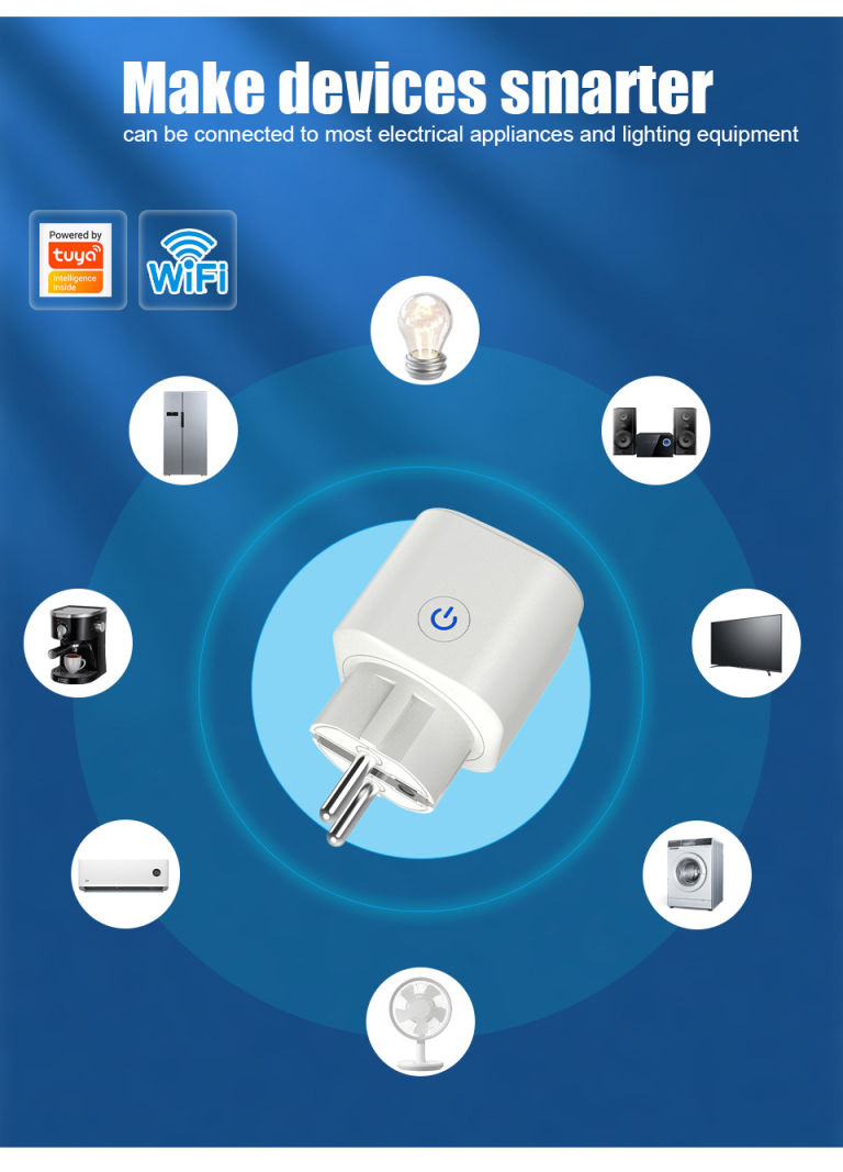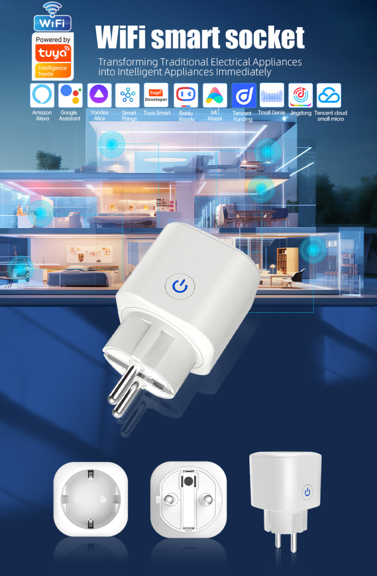 This smart socket offers remote control, timer functionality, and supports Tuya protocol, allowing users to manage appliances via a smartphone app. It is compatible with Alexa, Google Assistant, and the Tuya platform for voice control, providing easy operation. The simple design works with most household devices, enhancing energy efficiency and smart home features.
