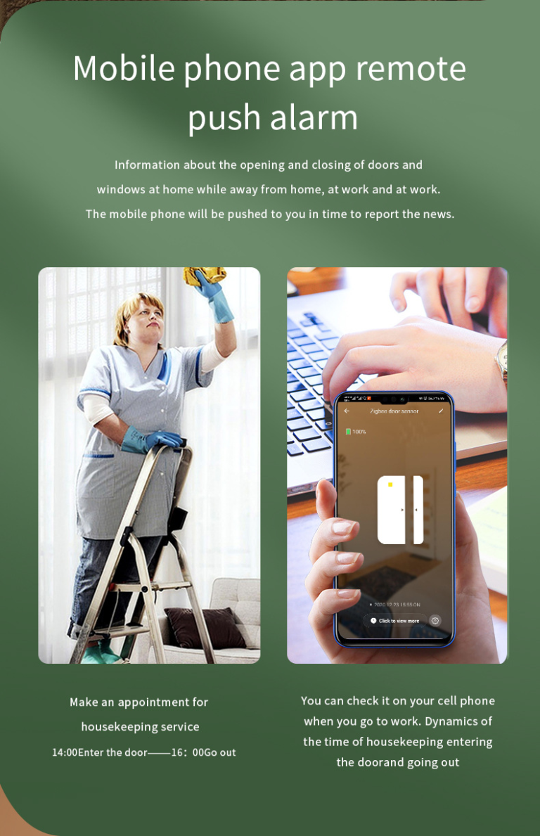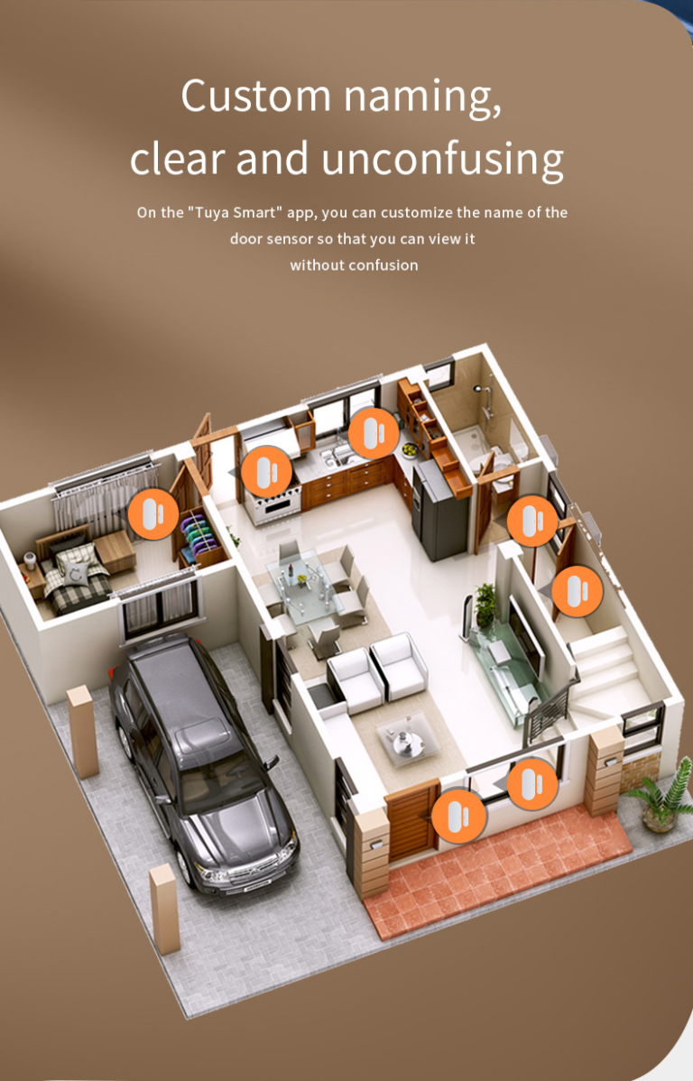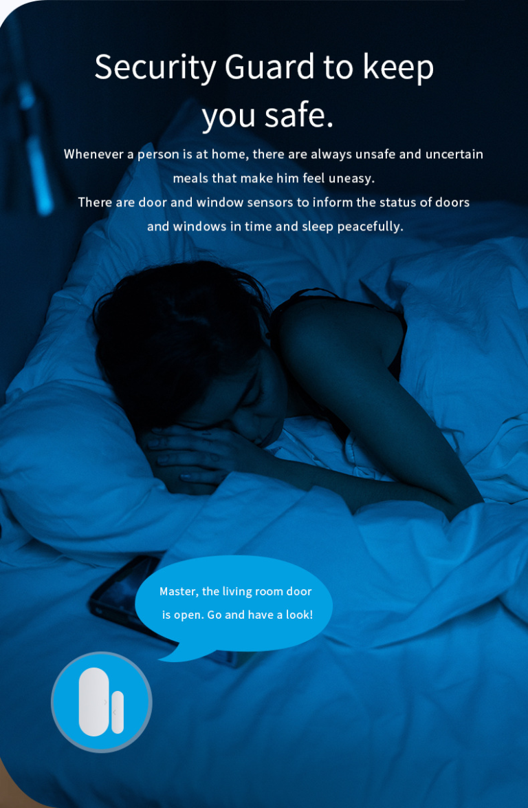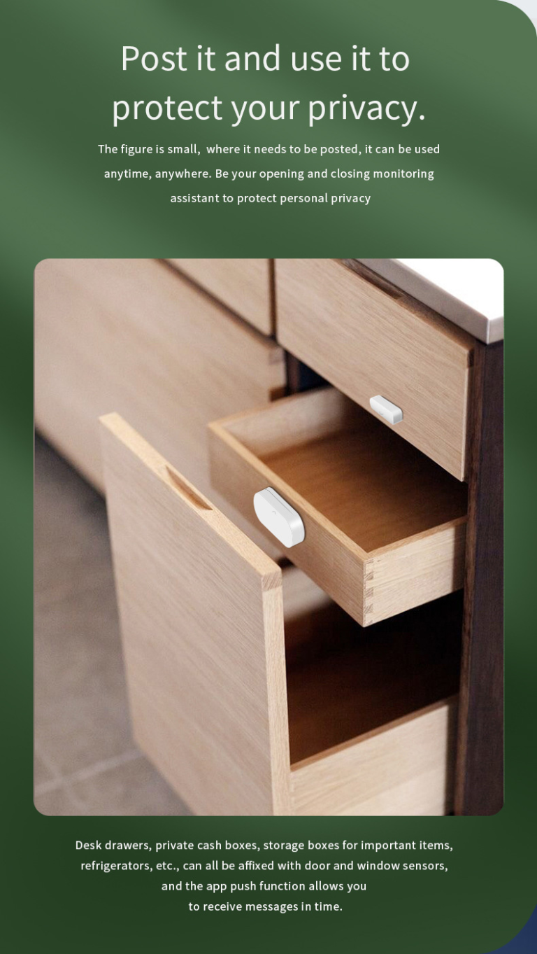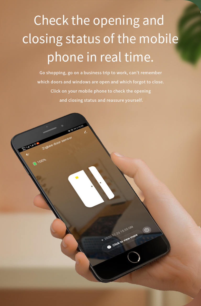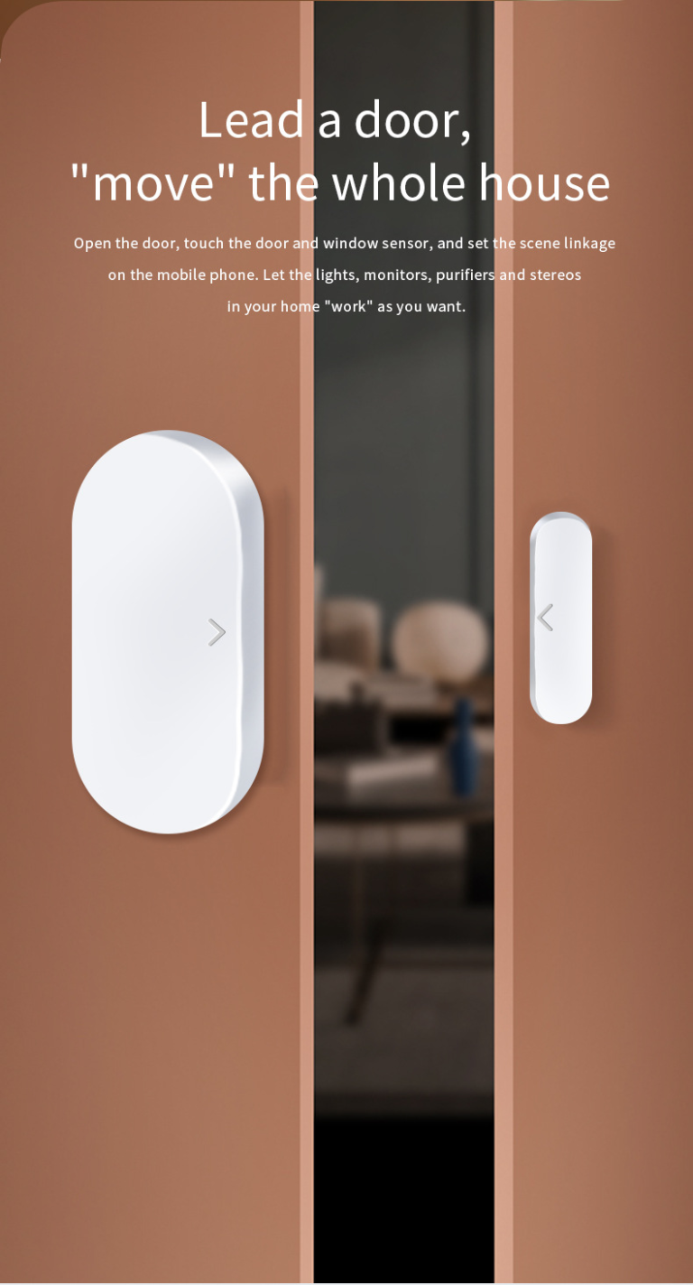 ZigBee smart door sensor & window sensor with wireless contact detection. It allows real-time status monitoring via app and supports alarm notifications and smart scene linkage, suitable for home and apartment security applications.